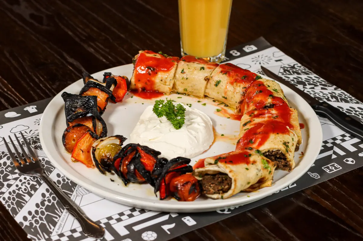 Carne molida típica árabe al grill envuelto en pan pita hecho en casa vegetales a la parrilla y labne (yogurt griego)